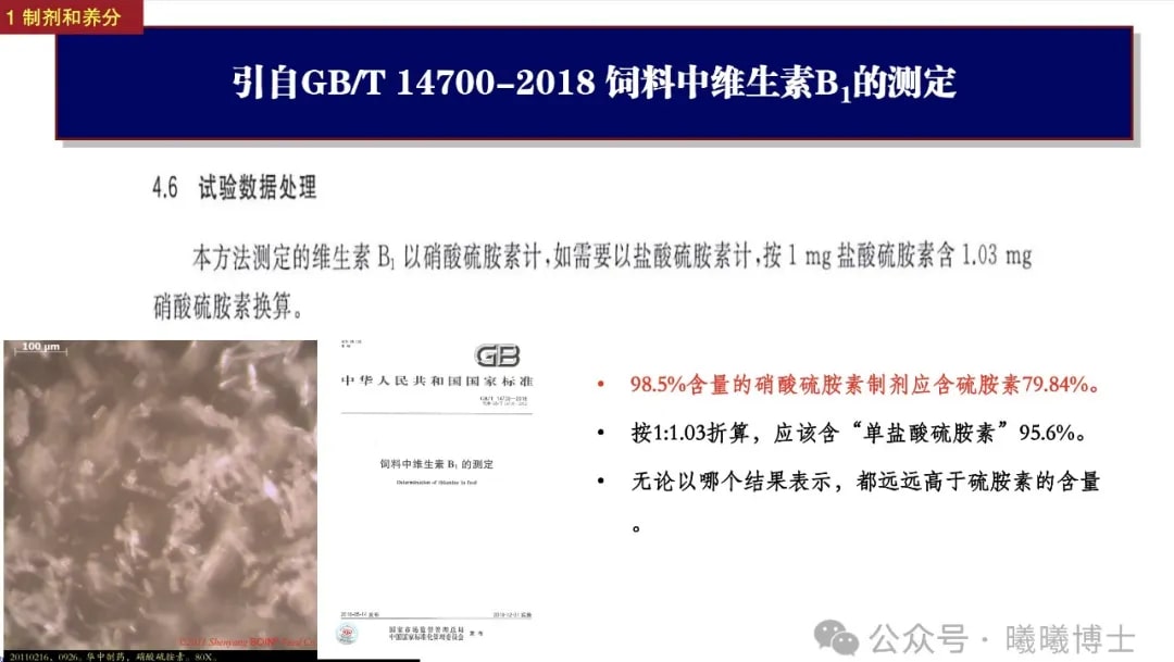 王昕陟博士:首先,我們一定要區(qū)分「制劑」vs.「養(yǎng)分」這兩個概念。制劑里有養(yǎng)分,但由于生產(chǎn)制劑時,常常需要載體、乳化劑等,所以很少能做到制劑里全部都是養(yǎng)分。對飼料行業(yè)來說,很多B族維生素是結(jié)晶體,能做到含量98%以上,但還有很多維生素制劑(尤其是脂溶性維生素)是做不到那么高的。