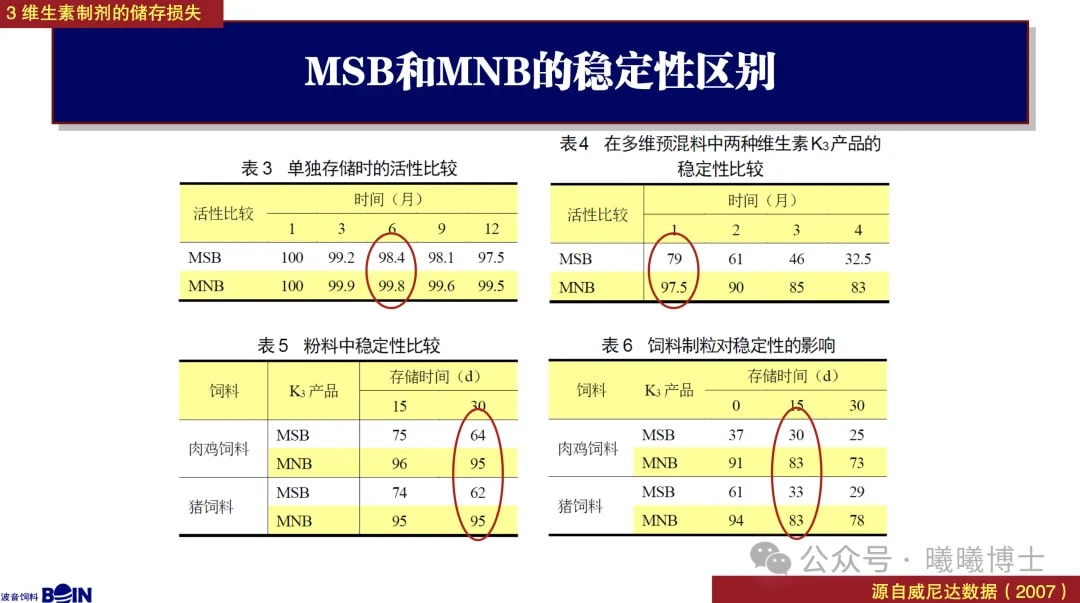 MSB和MNB在單獨儲存時,穩(wěn)定性相差還不大。但放到復(fù)合維生素里,差距就出來了。我們做過實驗,在四個月的時間跨度中,多維預(yù)混料中MSB的活性就遠低于MNB了(表4: 32.5% vs 83%)。將預(yù)混料用于全價飼料,無論是以粉料還是和顆粒料的形式,飼料放置15天和30天后,MSB活性都低于MNB(表5、表6)。