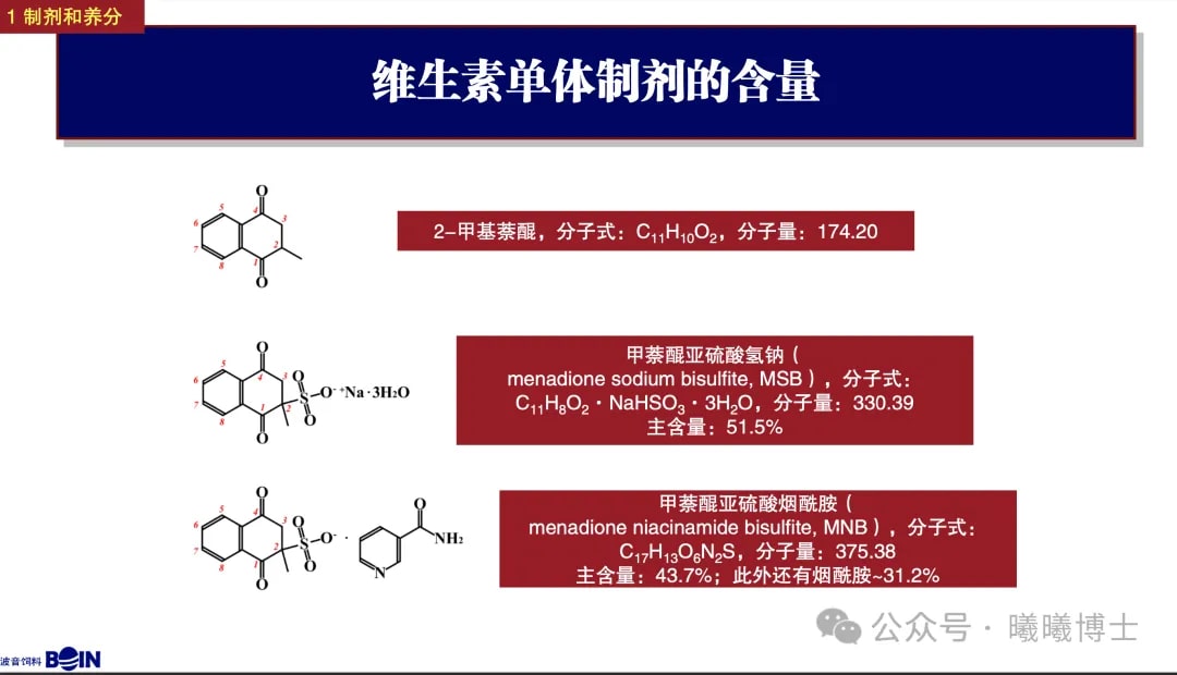 維生素K就是一個典型例子 —— 「2-甲基萘醌」是維生素K的有效成分;在生產(chǎn)中,我們常用的兩種制劑為「甲萘醌亞硫酸鈉」(MSB)和「甲萘醌亞硫酸煙酰胺」(MNB)。