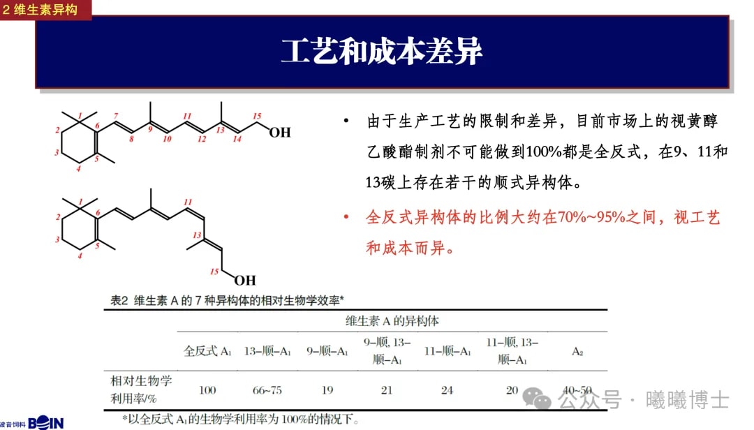 維生素A在9、11、13的碳上可能出現(xiàn)順式結(jié)構(gòu),而順式結(jié)構(gòu)的生物效率遠遠低于反式結(jié)構(gòu)(看下圖??)。全反式的維生素A生物利用率可能是100%,但有9-順的維生素A就只有19%了,差異巨大!然而,一般飼料企業(yè)使用的液相色譜儀對色譜柱的區(qū)分能力不足,很難分辨出順反式異構(gòu)體,導(dǎo)致難以評估維生素試劑中有效的活性成分。