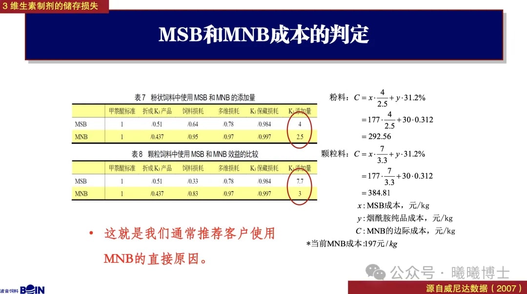 從計算的結(jié)果可以看出,對粉料而言,動物要攝入1份甲萘醌,需要4份MSB vs. 2.5份MNB。若是顆粒料,則需要7.7份MSB vs. 3份MNB,添加量差距更大。